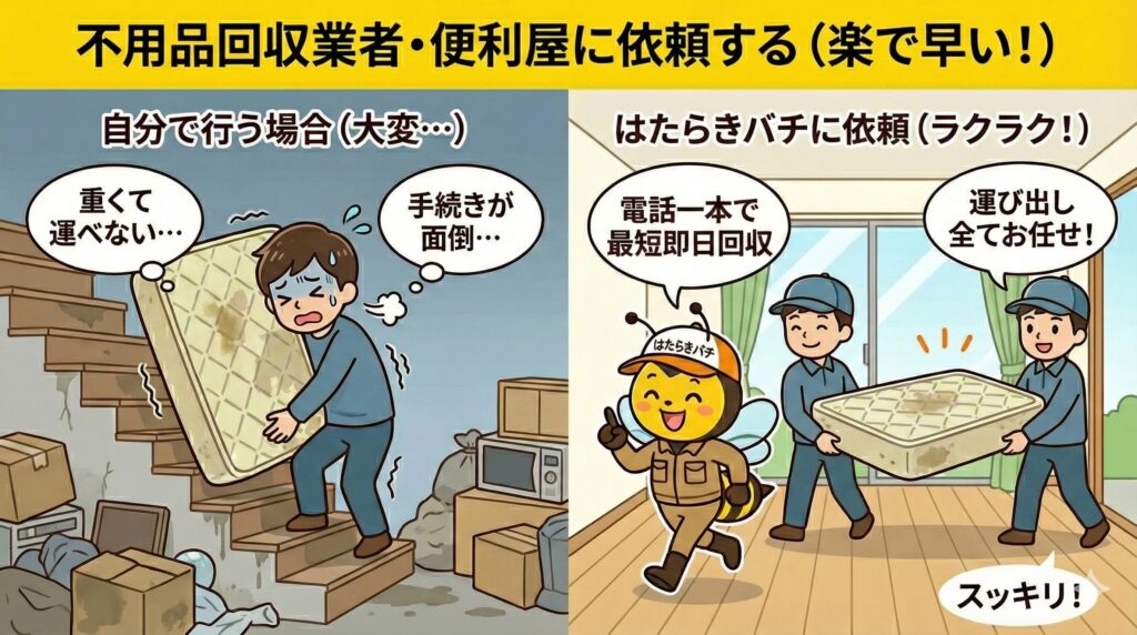 「重くて運べない」「急な引越しですぐに捨てたい」という方に最適なのが、不用品回収業者や便利屋への依頼です。 最大のメリットは「電話一本で部屋まで取りに来てくれること」です。重いマットレスを自分で動かす必要は一切ありません。また、土日祝日の対応や、即日回収が可能な業者も多く、自分のスケジュールに合わせて処分できます。さらに、ベッドフレームや布団、その他の不用品もまとめて処分できるため、一気に部屋を片付けたい時に非常に頼りになります。